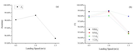 Figure 7 shows the accuracy (a) and F1 (b) of LDGNet for damping orifice area (AS) fault detection. As shown in Figure 7a, accuracies under normal (1.0 m/s) landing condition are greater than accuracy under soft (0.5 m/s) and heavy (1.5 m/s) landing condition. Accuracies under all landing speed conditions are larger than 95.00%, and accuracies under soft (0.5 m/s) and normal (1.0 m/s) are greater than 98.00%. As shown in Figure 7b, F1 scores have similar variation tendency with accuracies under damping orifice area (AS) conditions, F1 scores under normal landing condition are greater than F1 scores under soft and heavy landing condition. F1 scores under all landing speed conditions are all lager than 94.00%, and accuracy under soft and normal conditions are greater than 97.50%.