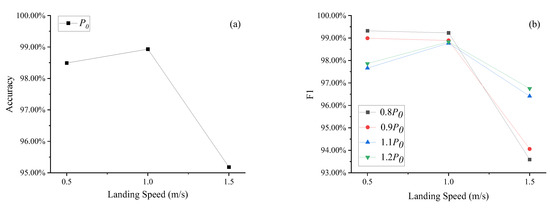 Figure 8 shows the accuracy (a) and F1 score (b) of LDGNet for initial gas pressure (P0) fault detection. Similar with damping orifice area (AS) fault conditions, accuracies under normal (1.0 m/s) landing conditions are greater than accuracies under soft (0.5 m/s) and heavy (1.5 m/s) landing conditions. Accuracies under all landing speed conditions are all larger than 95.00%, and accuracies under soft (0.5 m/s) and normal (1.0 m/s) are greater than 98.00%. As shown in Figure 8b, F1 scores under all landing speed conditions are all larger than 93.00%, and accuracy under soft and normal landing conditions are greater than 97.50%. For P0 reduction conditions (0.8P0 and 0.9P0), F1 scores under normal landing condition are close to F1 scores under soft landing condition, and greater than F1 scores under heavy landing conditions. For P0 increasing conditions (1.1P0 and 1.2P0), F1 scores under normal landing condition are greater than F1 scores under both soft and heavy landing conditions.