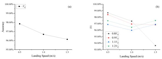 Figure 9 shows accuracy (a) and F1 (b) of LDGNet for initial volume (V0) fault detection. As shown in Figure 9a, accuracies reduce with an increase in landing speed. Accuracies under all landing speed conditions are greater than 95.00%. As shown in Figure 9b, F1 scores under all conditions are greater than 93%, and F1 scores under soft and normal landing conditions are greater than 95.50%. For V0 reduction conditions (0.8V0 and 0.9V0), F1 scores reduce with an increase in landing speed. For V0 increase conditions (1.1V0 and 1.2V0), F1 scores under normal landing condition are greater than F1 scores under soft and heavy landing conditions.
