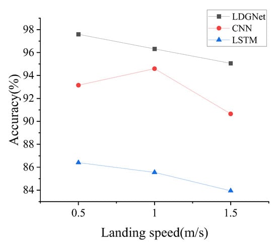 This subsection focuses on comparison between the proposed LDGNet and existing methods, including the CNN and LSTM. The database built in Section 4.1 is applied to the CNN and LSTM for model training and accuracy verification. The accuracy of under all landing conditions are compared to evaluate the performance of the proposed LDGNet. As shown in Figure 10, the accuracy of LDGNet is higher than CNN and LSTM under all landing conditions. Via extracting features in the time and spatial domain, the developed LDGNet could offer a better performance in health monitoring than CNN and LSTM.