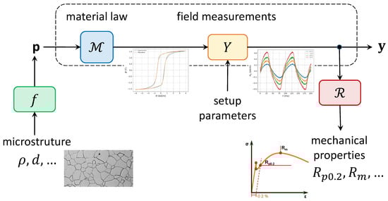 Conceptual image of a magnetic characterisation task. The material parameters , controlled by the underlying microstructural features, are indirectly determined via dedicated field measurements and can be obtained by the inversion of the total transfer operator . The electromagnetic measurements can be also used for indirect assessment of the mechanical properties via specially designed regressors.