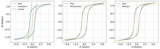 There is a plethora of magnetic hysteresis models in the literature, such as the Preisach model [46], the Jiles–Atherton model [47,48], the Stoner–Wohlfarth model [46], the Hauser (or energetic) model [49], the Mel’gui model [50], and the dry-friction model [51], just to mention some of the most well-known among them. One may also mention the Rayleigh model [52], but, since this model is only applicable in the weak-field region, it has been deliberately omitted from the above list. It can be, however, used as a constitute of hybrid formulations for the improvement of the calculations at the low-field domain, where most of the above models behave rather poorly [53].