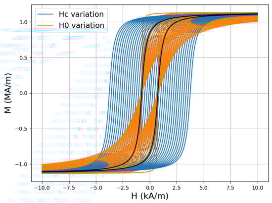 The results of the previous analysis can be complemented by numerical studies with the Ponomarev model in Expression (17) for variable and and by calculating the harmonic coefficients of the resulting magnetisation signal via Fourier transform. As study material, we consider the same IF steel grade used for the studies in [55]. The material parameters are obtained by the identification of the experimental curves, following the standard procedure, and they are summarised in Table 2. We then let and vary in the interval 10–500% with respect to their nominal value. The resulting bunch of curves obtained with the considered values are demonstrated in Figure 6.