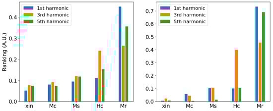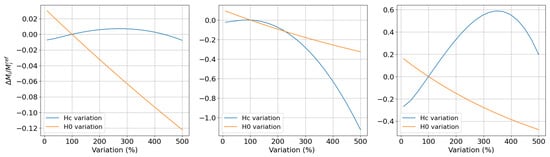 The relative variation of the first three harmonics with respect to their value obtained for the original curve is illustrated in Figure 7. From a comparison of the curves, it turns out that variations result in a stronger variation of the higher harmonics than the ones when varying . In other words, the sensitivity of the harmonic measurements with respect to the coercive field is stronger that that for the form factor . In this particular example, the curves corresponding to variation have been multiplied by a factor of 100.