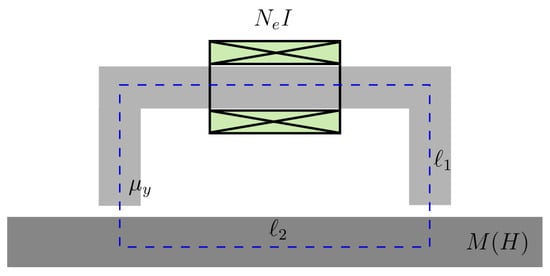 In the case of the closed magnetic circuit in Figure 3, a simple coarse approximation can be obtained by using the well-known magnetic circuit model. The very low magnetic reluctivity of the yoke allows us to assume that the magnetic flux is preferentially contained inside the yoke volume, with only a weak proportion of the magnetic streamlines straying away. Furthermore, since the yoke core has a very low conductivity, the eddy-current effect can be ignored, which implies that the magnetic field distribution throughout the yoke cross-section is nearly homogeneous.