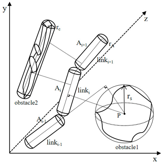 Given that obstacles and robotic links are often irregular geometric entities in practical applications, this study adopts the geometric envelope method to facilitate their modeling [27]. Specifically, irregular obstacles are represented by spheres or spherical cylinders, whereas robotic links are characterized as spherical cylinders. The simplified collision detection model is illustrated in Figure 1.