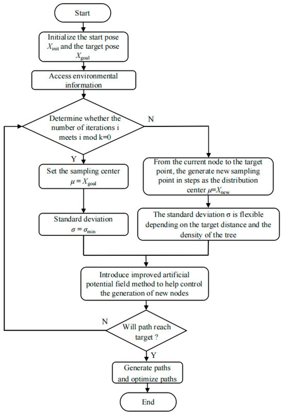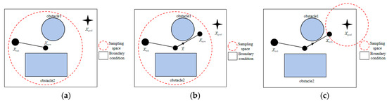 During the initial phase of node expansion, the sampling distribution center is set at the most recent node of the tree . A larger initial standard deviation is then employed to facilitate expansion along the tree’s boundary, explore new path branches, cover a broader workspace, and avoid local optima. During the target point guidance phase, the sampling distribution center is adjusted to the target point after every fixed number of iterations (this study sets to 10). The standard deviation is subsequently reduced, concentrating sampling points around the target . This adjustment enhances the exploration capability of the target area and accelerates the convergence of the tree. In subsequent iterations, at fixed intervals, the directional vector from the latest node of the current tree to the target point is calculated, normalized to a unit vector, and used to generate a new sampling point based on the direction and step length. This sampling point is then established as the new sampling distribution center , ensuring that the adjustment is dynamic and gradually approaches the target point. The mathematical expression for the sampling distribution center is as follows: