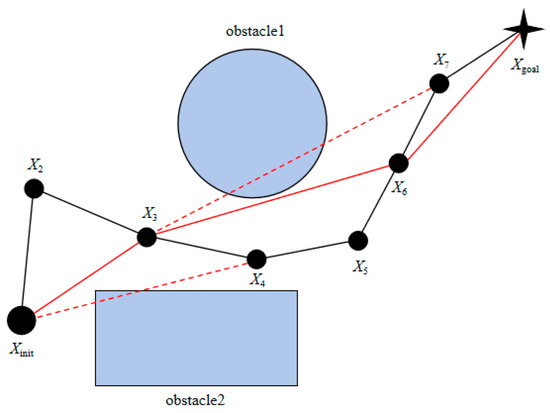 As shown in Figure 4, the black line is the original path, the red dashed line is the collision detection, and the red line is the new optimized path. Starting from the starting point of the path, check the node set in the path sequentially. The connection between and node and the connection between and node do not collide with obstacles. A collision occurs between and node , so add node to the new path; then, take node as the detection point, and find that the connections between node and node , node and node , and node and node do not collide with obstacles. A collision occurs between node and node , so add node to the new path; then, take node as the detection point, find that the connections between node and node and node and node do not collide with obstacles, and node add to the new path. Therefore, the optimized new path is as follows: