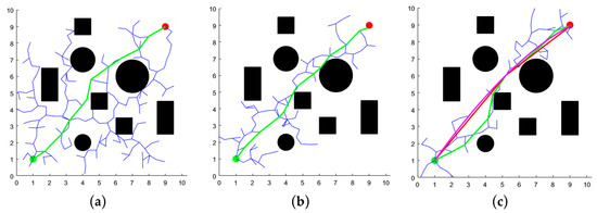 In MATLABR2022b, two distinct two-dimensional map environments were constructed: one representing a simple discrete layout and the other a complex narrow configuration. The map size was set to 10 m × 10 m, with the starting point located at (1, 1) m and the target point at (9, 9) m. The maximum number of iterations for the three algorithms was set to 2000, with a search step size of 0.5 m and a distance threshold of 0.3 m for the target point. The experimental results are presented in Figure 7 and Figure 8, where the black circles and rectangles represent obstacles, green curves denote the initial paths, red indicates redundant path removal, purple corresponds to the final path, blue illustrates the branches of the random tree, green dots mark the starting points, and red dots denote the target points of the path.