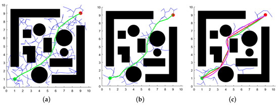 Simulated path trajectories for each algorithm. (a) RRT* algorithm; (b) APF-RRT* algorithm; (c) XN-RRT* algorithm.