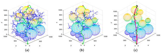In order to evaluate the effectiveness of the proposed algorithm in three-dimensional (3D) environments, a simulation map was constructed using MATLAB. The map’s dimensions were set to 1000 m × 1000 m × 1000 m, with the initial point located at (0, 0, 0) m and the target point at (900, 900, 900) m. The maximum number of iterations for the three algorithms was set to 5000, with a search step size of 50 m and a target point distance threshold of 30 m. The experimental results are presented in Figure 9.