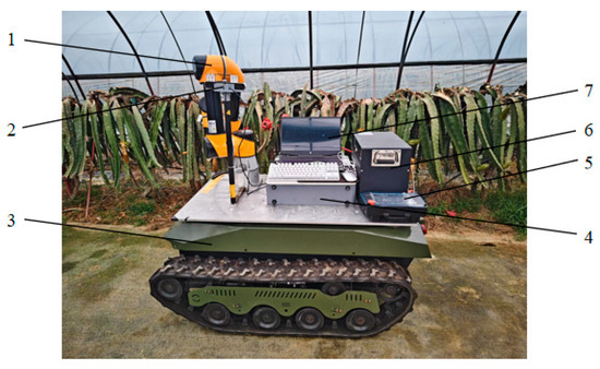 Dragon-fruit-picking robot. (1: robotic arm; 2: ZED binocular camera; 3: tracked chassis car; 4: control cabinet; 5: teaching pendant; 6: power supply; 7: host computer).