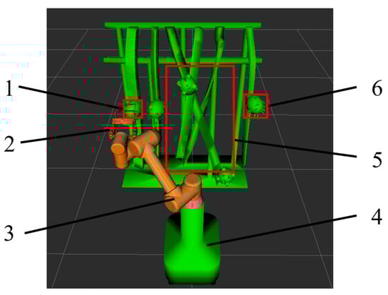 Simulation of dragon fruit picking environment. (1: initial position of robotic arm; 2: picking end-effector; 3: robotic arm; 4: Base; 5: branches and fruit obstacles; 6: target fruit).