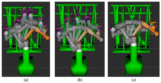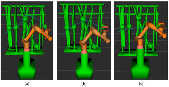 The process of path planning for the picking robot under various algorithms is illustrated in Figure 12. In the figure, the blue curve denotes the trajectory of the robot’s picking end-effector. The motion path of the robot for each algorithm is depicted by continuous white models, as shown in Figure 13. To evaluate the performance of each algorithm in the robot’s path planning, 100 independent tests were conducted for each algorithm within the simulation environment, and the means of the performance metrics were computed, as shown in Table 3.