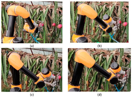 Actual obstacle avoidance path for dragon fruit picking. (a) Initial posture; (b) obstacle avoidance posture 1; (c) obstacle avoidance posture 2; (d) reached target attitude.