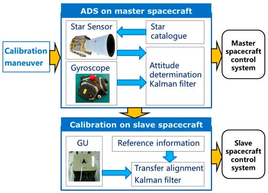 The inter-spacecraft rapid transfer alignment model is derived to calibrate the GU on the slave spacecraft based on the ADS on the master spacecraft. The basic principle of the considered transfer alignment system is illustrated in Figure 1.