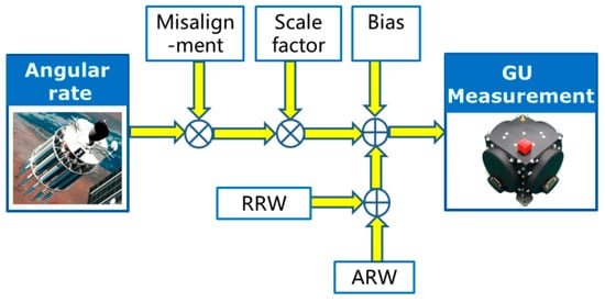 For the design of the transfer alignment filter, the state equation of the transfer alignment model is established based on the attitude kinematics and the error model of the GU on the slave spacecraft. In this paper, the GU is supposed to be three gyroscopes which measure the angular rate of the slave spacecraft relative to the inertial frame. The GU error model includes gyroscope bias, scale factor error, misalignment and random noise composed of angle random walk (ARW) and rate random walk (RRW), as shown in Figure 2.