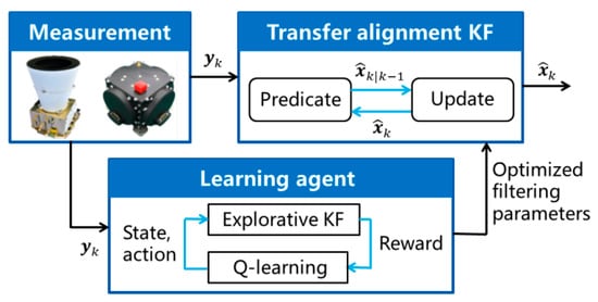 It is seen from Algorithm 1 that the efficiency of the update to the prediction with the measurement innovation depends on the Kalman gain , which is adjusted through the noise covariance matrices and . In the measurement noise covariance matrix, and are symmetric positive definite matrices determined according to the measurement error behavior of the star sensors and the GU specified by the manufacturer. In the process noise covariance matrix, the elements related to and are determined with the ARW and RRW coefficients, which are achievable through the Allan variance analysis [42]. However, it is difficult to determine the accurate noise covariance for the calibration parameters in the absence of prior knowledge. As mentioned in the introduction, the proper choice for the process noise covariance matrix is critical for accurate transfer alignment. The state estimate of the KF may deviate from its actual value if is not set appropriately. In order to identify the unknown elements in , a Q-learning-based filtering algorithm is presented in the next section as a modification of the standard KF.