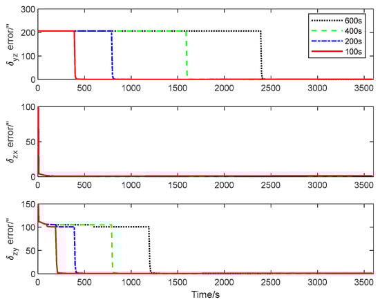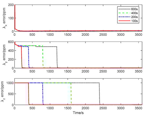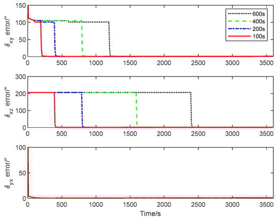 Note that both the measurement noises of the ADS on the master spacecraft and the GU on the slave spacecraft are contained in Equation (33). Generally, to implement the inter-spacecraft rapid transfer alignment effectively, the ADS on the master spacecraft should be more accurate than the GU on the slave spacecraft. It is expected that the systematic errors in the ADS on the master spacecraft have been compensated before the implementation of the inter-spacecraft rapid transfer alignment.
