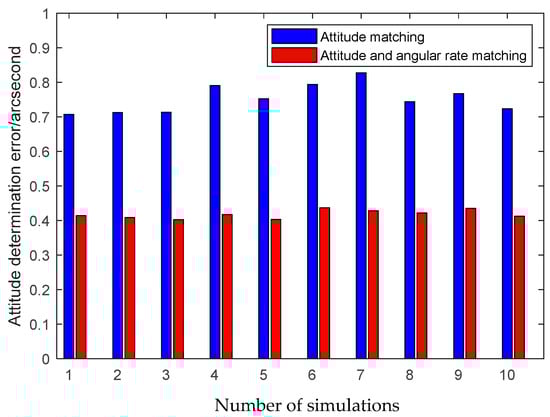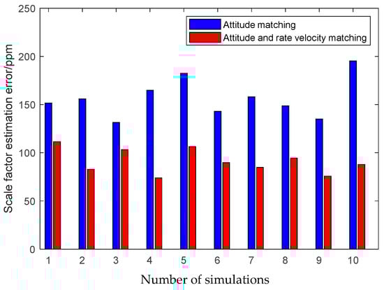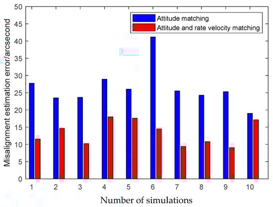The first simulation is performed to illustrate the high performance of the attitude plus angular rate matching scheme presented in Section 2. The presented attitude plus angular rate matching scheme is compared with the traditional attitude matching scheme via the simulation. The average RMS errors of the attitude plus angular rate matching scheme and the attitude matching scheme for the estimation of the attitude and the calibration parameters obtained from 10 individual trials are plotted together in Figure 7, Figure 8 and Figure 9.