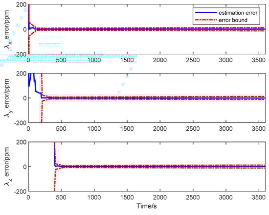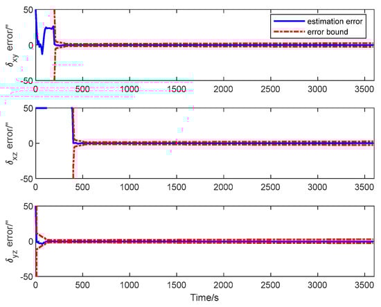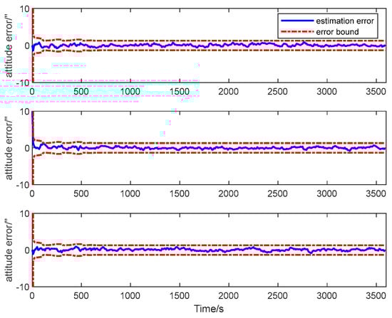 The estimation error curves of the attitude and the calibration parameters as well as their corresponding error bounds computed from the filter’s error covariance matrix are shown in Figure 10, Figure 11 and Figure 12.
