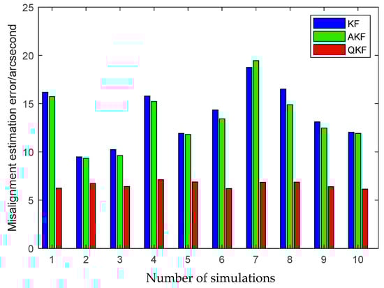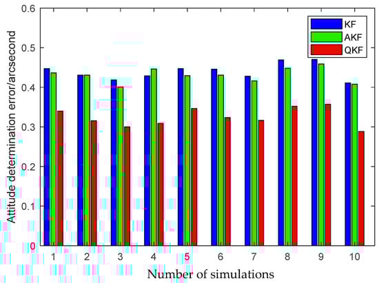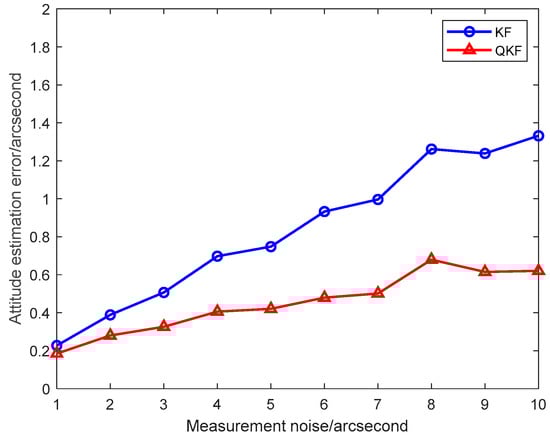 To illustrate the performance of the presented QKF algorithm in different scenarios, the numerical simulation is implemented with different measurement noise levels. In the inter-spacecraft rapid transfer alignment system, when the attitude measurement noise standard deviation increases from 1″ to 10″, the average attitude estimation RMS errors of the KF and the QKF obtained from 10 individual trials are plotted in Figure 16. It indicates that the QKF algorithm is less sensitive to the variation in the measurement noise levels.