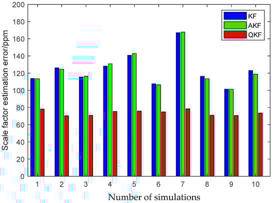 The above figures illustrate that the QKF obtains the highest state estimation accuracy in comparison with the KF and the AKF. This result is distinguishable in terms of both the attitude and the calibration parameters estimation. It indicates that the QKF is more effective than the AKF to identify the appropriate process noise covariance matrix and consequently improves the filtering performance.