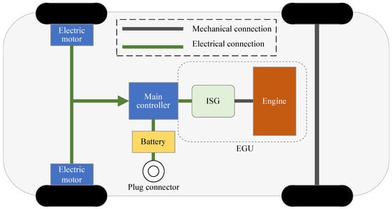 The research subject of this paper is a plug-in hybrid electric vehicle (PHEV). The vehicle is powered jointly by an Engine Generator Unit (EGU) and a battery, where the EGU consists of an engine and an Integrated Starter Generator (ISG) motor that is mechanically connected. The battery is connected to the drive motor through a Main Controller. The schematic diagram of the Plug-In Hybrid Electric Vehicle used in this study is shown in Figure 1. The main component parameters are listed in Table 1.