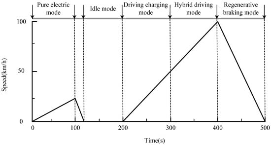 PHEVs primarily operate in five modes: pure electric, charge while driving, hybrid drive, regenerative braking, and parking mode, as shown in Figure 2. The data of the five driving modes in Figure 2 are derived from Table 2.
