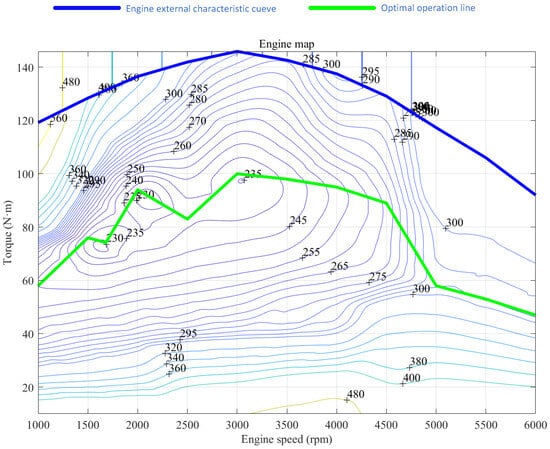 In Figure 3, the blue line represents the external characteristic curve of the engine, while the green line indicates the optimal operating curve. The circular curve in the figure represents the equivalent fuel consumption rate, measured in units of kg/KWh.