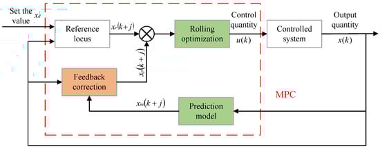 This study integrates speed prediction and deep reinforcement learning energy management within the MPC framework. MPC is a flexible control framework that can be combined with any control algorithm to achieve real-time control. The fundamental idea of MPC is to utilize an existing model, the current state of the system, and future control variables to predict the future output of the system. The control process of MPC consists of four components: trajectory reference, prediction model, rolling optimization, and feedback correction. The solving process of MPC is illustrated in Figure 6.