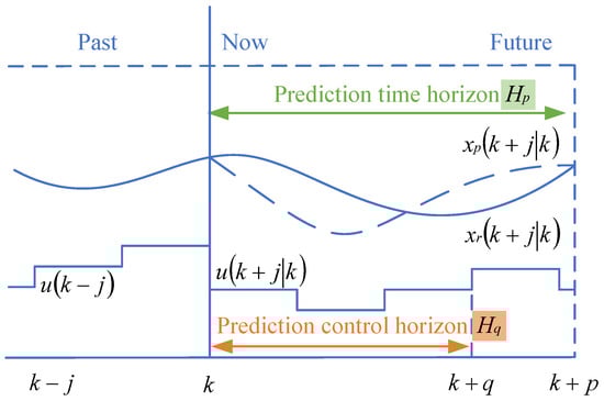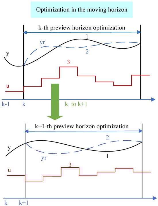 Rolling optimization: This is the most critical step. Rolling optimization is used to comprehensively consider the reference trajectory and the input information from the prediction model to solve the optimization problems within the prediction horizon. Different optimization problems will have corresponding solution methods, commonly including linear programming, dynamic programming, sequential quadratic programming, and fuzzy optimization. Compared to other optimization control algorithms, especially global optimization algorithms, the essential difference in the rolling optimization step of MPC is that its objective function is not static; rather, it is continuously updated based on changes in the reference trajectory. Therefore, the optimization objective function may vary in each prediction horizon, and rolling optimization aims for optimality within the rolling time frame. As shown in Figure 7, rolling optimization is not conducted just once. As the prediction horizon is updated, the optimization is repeatedly performed. At the time k, the rolling optimization process yields the optimal control sequence within the prediction horizon, and the first control action is applied to the controlled system.