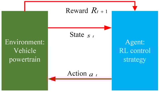 Although these control strategies integrate neural networks with MPC and ECMS methods to predict future vehicle control and manage vehicle states, challenges remain in adjusting the equivalence factor within ECMS. Additionally, refining the prediction horizon in MPC remains an urgent issue to be addressed. Compared to MPC, reinforcement learning (RL) can be trained under various operating conditions to obtain more suitable parameters []. Yang et al. introduced RL into the MPC framework and combined it with a novel speed prediction model to develop a new energy management strategy, significantly improving fuel economy. However, despite leveraging reinforcement learning, this control strategy still lacks sufficient improvements in the speed prediction model [].