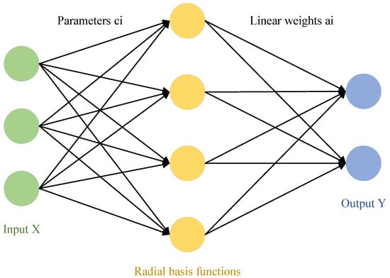where ; x is an n-dimensional input vector; is the center value of the i-th basis function, which has the same dimensionality as the input vector; represents the normalization constant of the width of the i-th basis function’s center; and is the norm of the vector , indicating the distance between x and . The Gaussian function value reaches its unique maximum at a specific center value of the basis function. According to the above function, as increases, the value of the basis function decreases, approaching zero. For a given input value , only a small region near the center of x is activated, the radial basis function is shown in Figure 18.