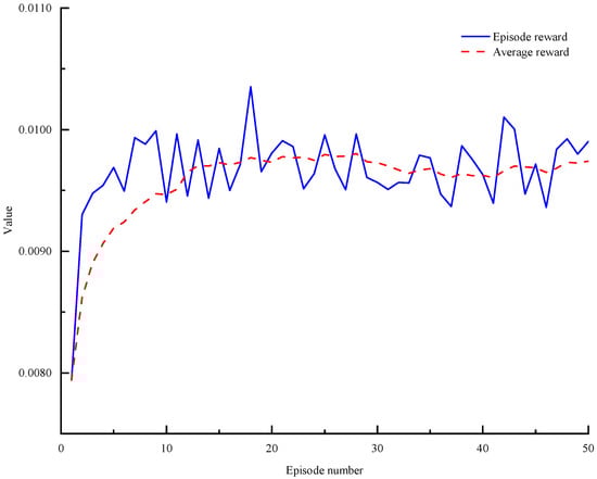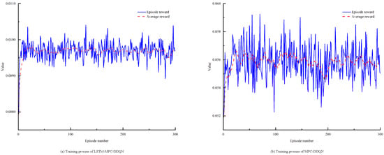 The goal of deep reinforcement learning is to maximize rewards, and the effectiveness of DDQN training is assessed by the increase in Q-values, which should ultimately stabilize and converge to a maximum value. Therefore, the choice of hyperparameters is crucial for the control effectiveness of deep reinforcement learning in energy management. The DDQN energy management system employs a three-layer BP neural network with 64 hidden units. In the velocity-prediction-based MPC-DDQN energy management strategy, a four-layer neural network is used, also with 64 hidden units. The parameter update algorithm for all reinforcement learning neural networks utilizes the RMSProp algorithm, with a learning rate of 0.0001, a sampling time of 0.01 s, and an episode setting of 50. Figure 20 illustrates the training process of the DDQN energy management agent. Figure 21 further demonstrates the training process of the LSTM-MPC-DDQN energy management strategy, indicating that the prediction accuracy and stability of LSTM-MPC-DDQN are superior to those of the MPC-DDQN energy management strategy.