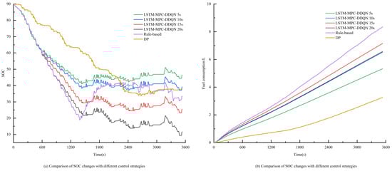 In the experiments conducted on the LSTM-MPC-DDQN energy management strategy, four prediction horizon lengths (5 s, 10 s, 15 s, and 20 s) were set. The results demonstrated that when the prediction horizon was 5 s, the strategy exhibited optimal performance, achieving the lowest equivalent fuel consumption at only 6.3220 L, representing a fuel saving of 2.034 L compared to the rule-based strategy. Additionally, the DP strategy achieved the lowest fuel consumption at 3.3856L. Due to its global optimization capabilities, the dynamic programming algorithm can identify the theoretical optimal solution and is commonly used as a benchmark for assessing the control effectiveness of other strategies. Verification under the UDDS driving cycle indicated that the LSTM-MPC-DDQN strategy saved 0.2729 L of fuel compared to the rule-based strategy and exhibited a fuel consumption difference of only 0.0749 L compared to the DP strategy.