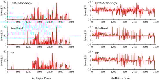 As shown in Figure 23, the output power of the engine and battery pack under different control strategies reveals that the output power of the dynamic programming (DP) and LSTM-MPC-DDQN strategies is lower than that of the RB strategy. This is primarily because DP, as a global planning control strategy, can plan across a global range. Additionally, the LSTM-MPC-DDQN control strategy utilizes velocity prediction to make better judgments in the time domain, avoiding the operation of the engine in inefficient areas. In contrast, the RB strategy can only distribute power according to predefined rules, lacking adaptive regulation and flexibility. It frequently switches during operation and, compared to DP and LSTM-MPC-DDQN, utilizes the battery pack less often, resulting in higher fuel consumption. On the other hand, based on previous experiments, setting the prediction horizon of LSTM-MPC-DDQN to 5 s not only ensures fuel economy but also maintains performance.