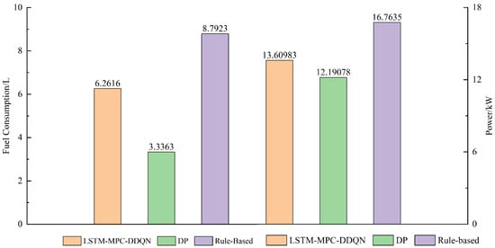 As shown in Figure 24, by integrating the fuel consumption and output power of each control strategy at every moment, we can obtain the total fuel consumption and total power output of the vehicle. Considering the fuel consumption data, the dynamic programming (DP) algorithm proves to be more efficient compared to the RB strategy proposed in this study. This is because both dynamic programming and LSTM-MPC-DDQN strategies can optimize planning in both the global and temporal domains, reducing unnecessary power output and fuel consumption, and thereby significantly enhancing overall efficiency. In contrast, the RB strategy, due to its inability to adapt to changing rules, fails to effectively predict and plan the power distribution between the engine and battery pack, resulting in relatively lower fuel efficiency.