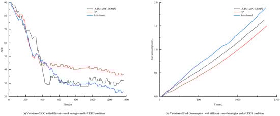 To verify the effectiveness of the proposed control strategy, simulations were conducted under the UDDS conditions and compared with other control strategies. The simulation results are shown in Figure 25. The figure indicates that the final SOC of our proposed strategy approaches the target value of 30%. In contrast, the RB strategy consumes more energy and fuel. This observation is supported by the data in Table 8, which demonstrates that the fuel economy of the LSTM-MPC-DDQN control strategy is superior to that of the RB control strategy.