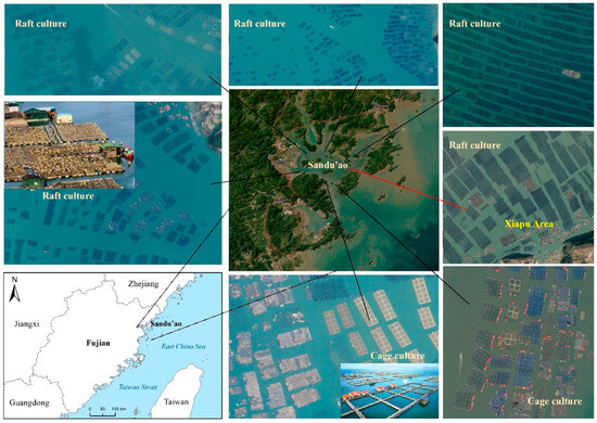 Sandu’ao, also known as Sansha Bay, is located in the southeastern part of Ningde City, Fujian Province, China. Covering a sea area of 102 km2 with 33 harbor mouths and 16 islands, it offers 110,000 mu (approximately 7333 hectares) of aquaculture space. This area is renowned as the hometown of the large yellow croaker in China, and is a famous fishing ground in eastern Fujian. Within this vast aquaculture zone, 15,000 cage aquaculture farms stretch for dozens of nautical miles, while over 6000 wooden huts bob up and down with waves. Additionally, raft aquaculture areas are scattered throughout and are mainly used for cultivating algae such as dragon’s beard seaweed. The distribution of these farms showcases a harmonious coexistence with the marine environment, ensuring sustainable development of the aquaculture industry, as shown in Figure 1. The lack of real-time monitoring of local aquaculture areas often leads to issues such as over-cultivation and encroachment of non-farming zones, ultimately causing significant marine pollution [17]. Consequently, to align with the government’s mandates for marine ecological conservation, fishery development planning, and the establishment of a modern fishing port system characterized by an aesthetically pleasing environment and orderly management, it is imperative to implement dynamic monitoring of these areas.