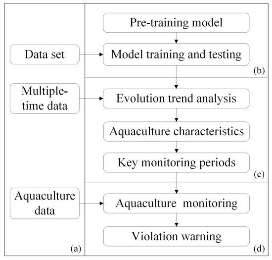(a) Data acquisition and pre-processing involves obtaining a dataset of model training and testing, multi-temporal data, and data of aquaculture areas to be monitored.