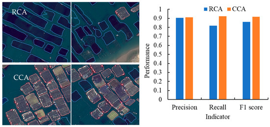 Model recognition effect and precision, recall, and F1 score of test samples in raft culture area (RCA, blue color) and cage culture area (CCA, red color).