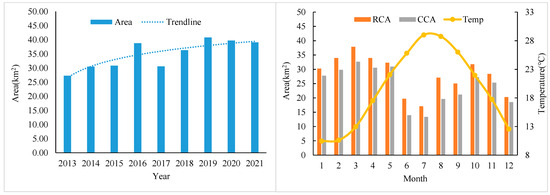 By identifying 36 images of the Xiapu area, the aquaculture area from 2013 to 2021 was obtained. Figure 5 shows the average annual and monthly aquaculture area in different years.