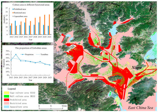 Figure 6 reveals that numerous breeding areas are located within the designated prohibited breeding zones. Analysis of data since 2013 shows significant changes in the areas of prohibited, restricted, and aquaculture zones within the Xiapu marine aquaculture region, as well as variations in the proportion of prohibited areas. From 2013 to 2021, the prohibited area experienced fluctuations, starting at 11.94 km2 in 2013, peaking at 18.3533 km2 in 2014, then decreasing to 12.81 km2 in 2015, and rising again to 15.96 km2 in 2016. After the establishment of aquaculture functional zones in 2017, the prohibited area notably declined to 11.971 km2. However, it continued to oscillate, increasing to 13.04 km2 in 2018, 16.10 km2 in 2019, and then decreasing slightly to 12.80 km2 in 2020 and 11.61 km2 in 2021. In contrast, the restricted area consistently increased from 14.80 km2 in 2013 to 26.64 km2 in 2021. The aquaculture area also expanded, particularly after 2016, indicating an increase in aquaculture activities despite the presence of prohibited and restricted zones. This aligns with findings from some studies suggesting that the growth in China’s marine development activities has led to increased exploitation of marine resources and subsequent expansion of mariculture areas.