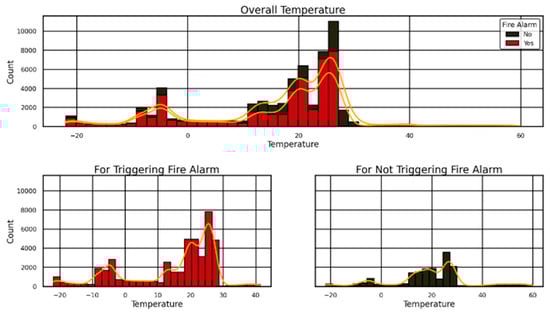 Figure 3 illustrates two patterns: fire alarms appear most frequently in the 20–40 °C temperature range (red bar for yes responses), and the black bar for no responses has lower frequencies at these temperatures but shows a fire risk threshold showed by orange KDE curve. Two subplots divide the data sets in