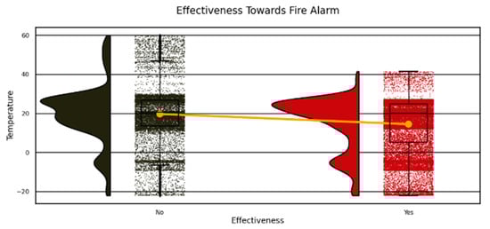 Figure 2, which demonstrates “Yes” alarm triggers occurring within the temperature range of 10–30 °C while “No” non-triggers exist primarily between 40 and 50 °C as reinforced by KDE curves. The visual graphs confirm how temperature functions as a critical factor in alarm operation and explain evacuation planning as well as sensor development.
