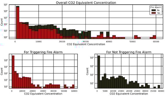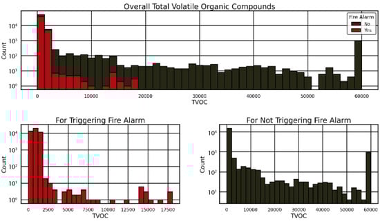 Figure 5 separates these distributions, with the “For Triggering Fire Alarm” subplot (red) peaking at low TVOC (0–1750) and the “For Not Triggering Fire Alarm” subplot (black) showing a broader distribution peaking at higher TVOC (10,000–60,000). These patterns, illustrated in