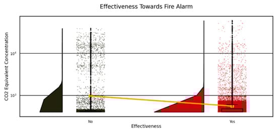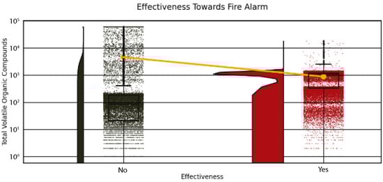 Further, this study analyzed the distribution of Total Volatile Organic Compounds (TVOC) in relation to fire alarm triggers to enhance safety protocols, as depicted in