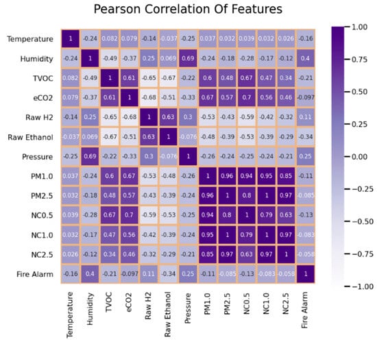 Figure 8. A Pearson correlation heatmap shows the magnitude of variable relationships between Temperature, Humidity, TVOC, eCO