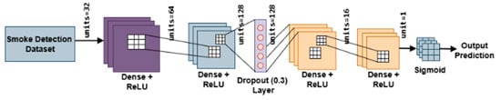 The developed neural network model, EvacuNet, performs binary fire alarm classification on IoT sensor data through a deep learning structure featuring dense layers along with activation functions, regularization, and dropout strategies that enhance both learning and generalization capabilities. Each layer within the network operates under defined mathematical equations.